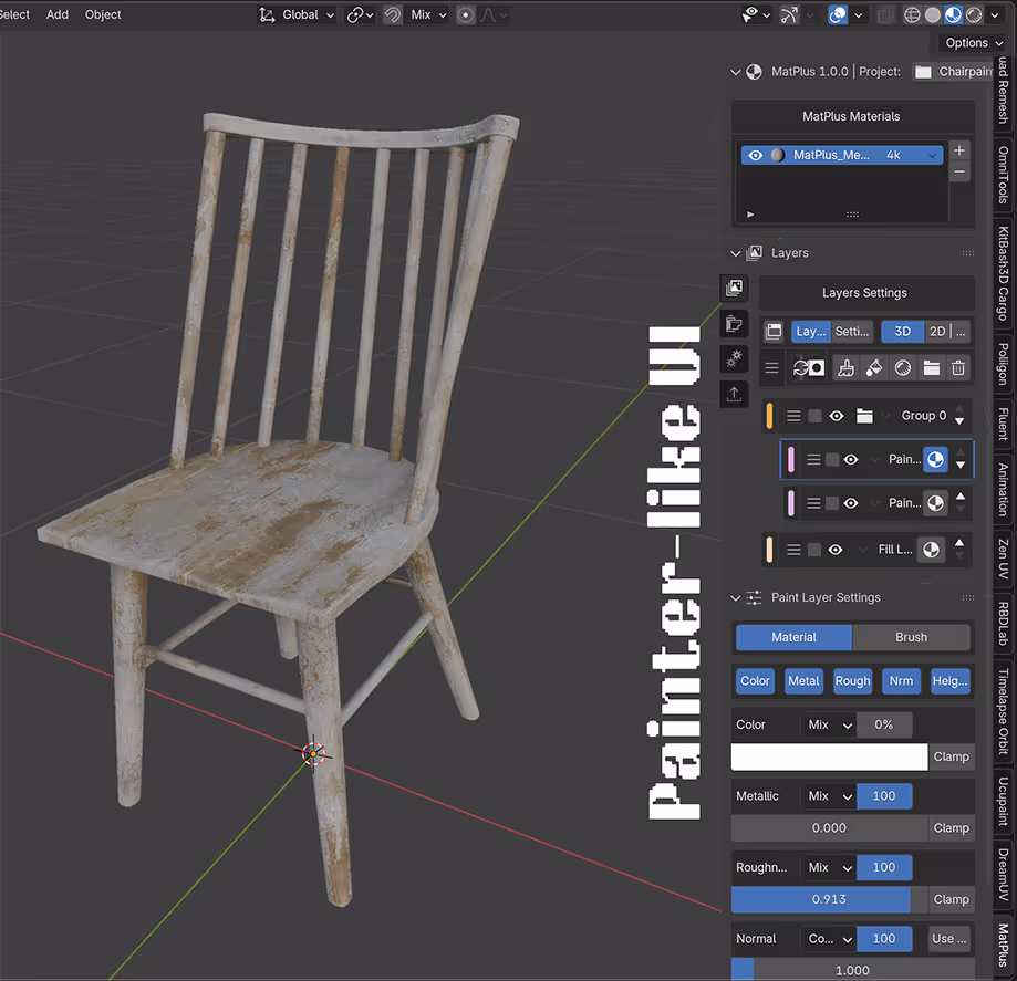 To me, MatPlus feels like it's very much trying to be Substance Painter in Blender. That's not necessarily bad! The problem comes (I think) from Blender fundamentally lacking certain texture painting functionality. Because of that, MatPlus is fighting against it's own foundation, and from my testing, felt very unstable. Ambitious, but not quite there yet.