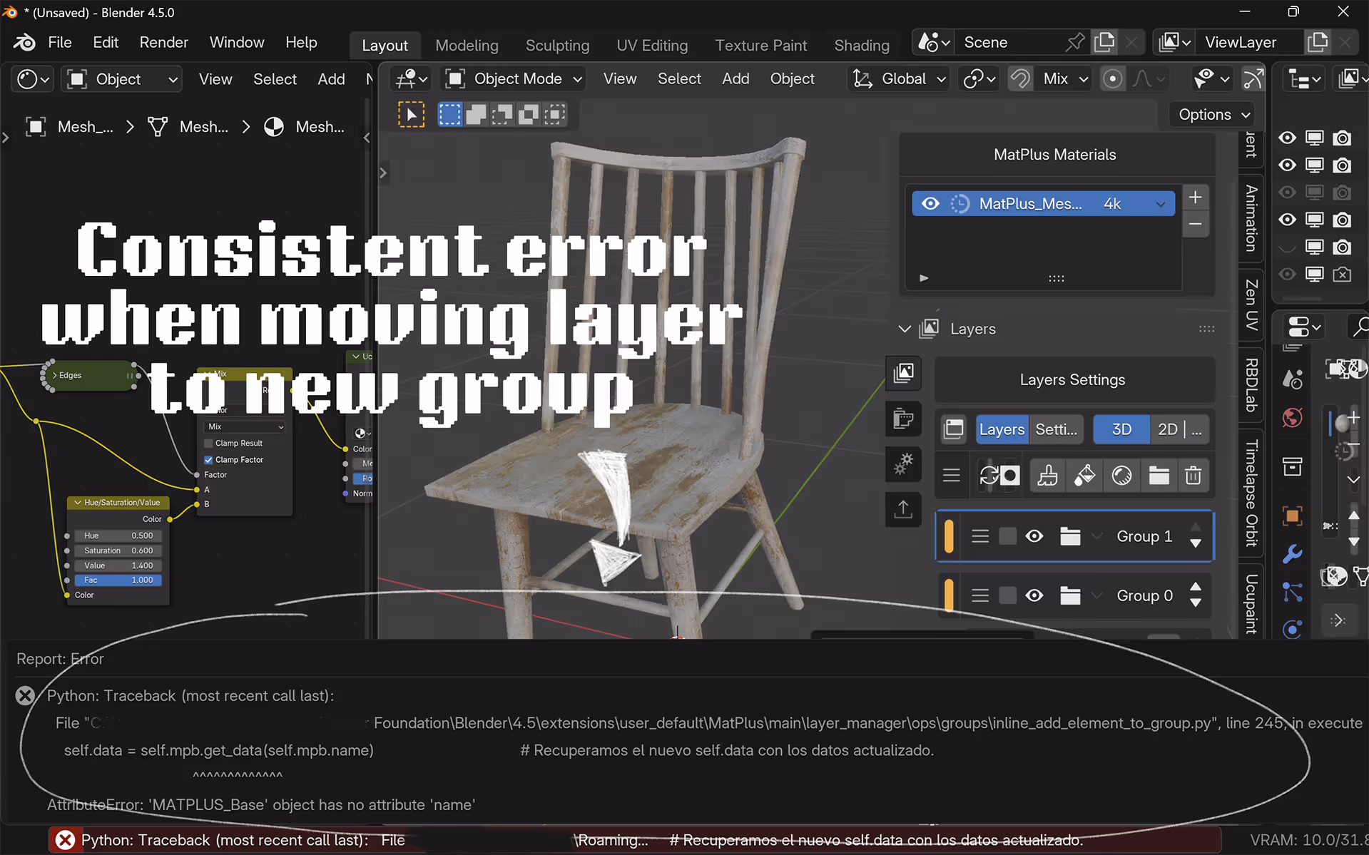 Many of the features I tested in MatPlus broke down or threw errors with just a bit of fiddling. Grouping layers threw me an error as soon as I tried to move a layer from one group to another (perhaps they want me to remove a layer, and then regroup it). Blender crashed when I tried to move a layer without first going out of paint mode into object mode. The color field on a new paint layer is somewhat meaningless since it's not unified with your selected texture paint brush.