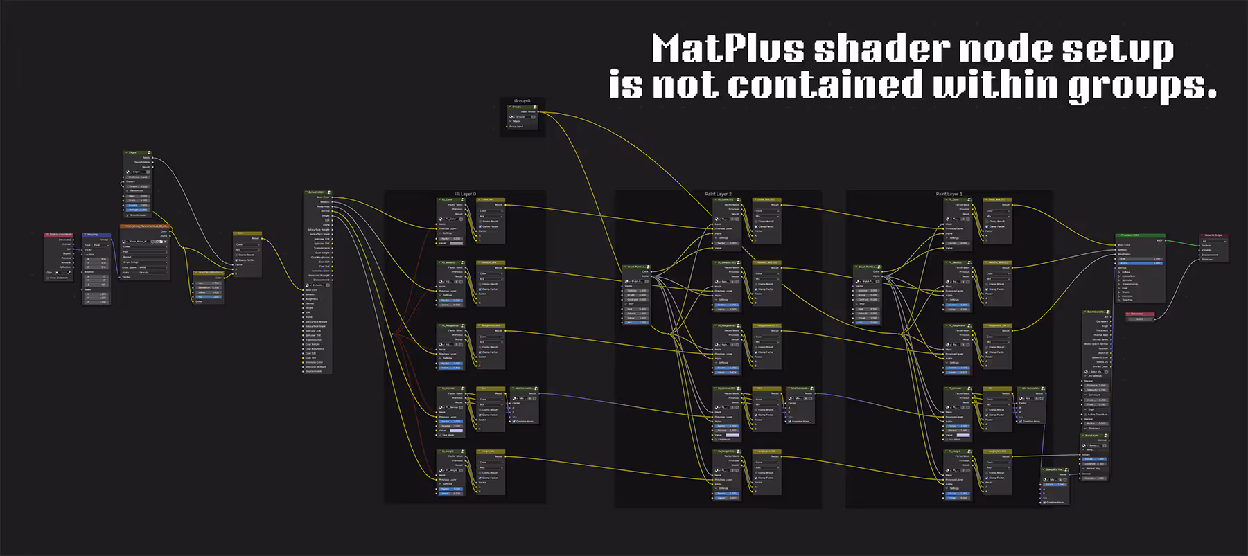 Another big hang-up I have with MatPlus is they leave their shader node network totally exposed and out in the open. This is dangerous. Compare to Ucupaint where each setup is a nice self-contained node group. I clearly see which inputs I can mess with, and what's running under the hood that I should stay away from. Is this an easy fix for MatPlus? I have no idea. But if it is, I strongly suggest they try to separate "front end" and "back end" here, so users are clear on what they can mess with.