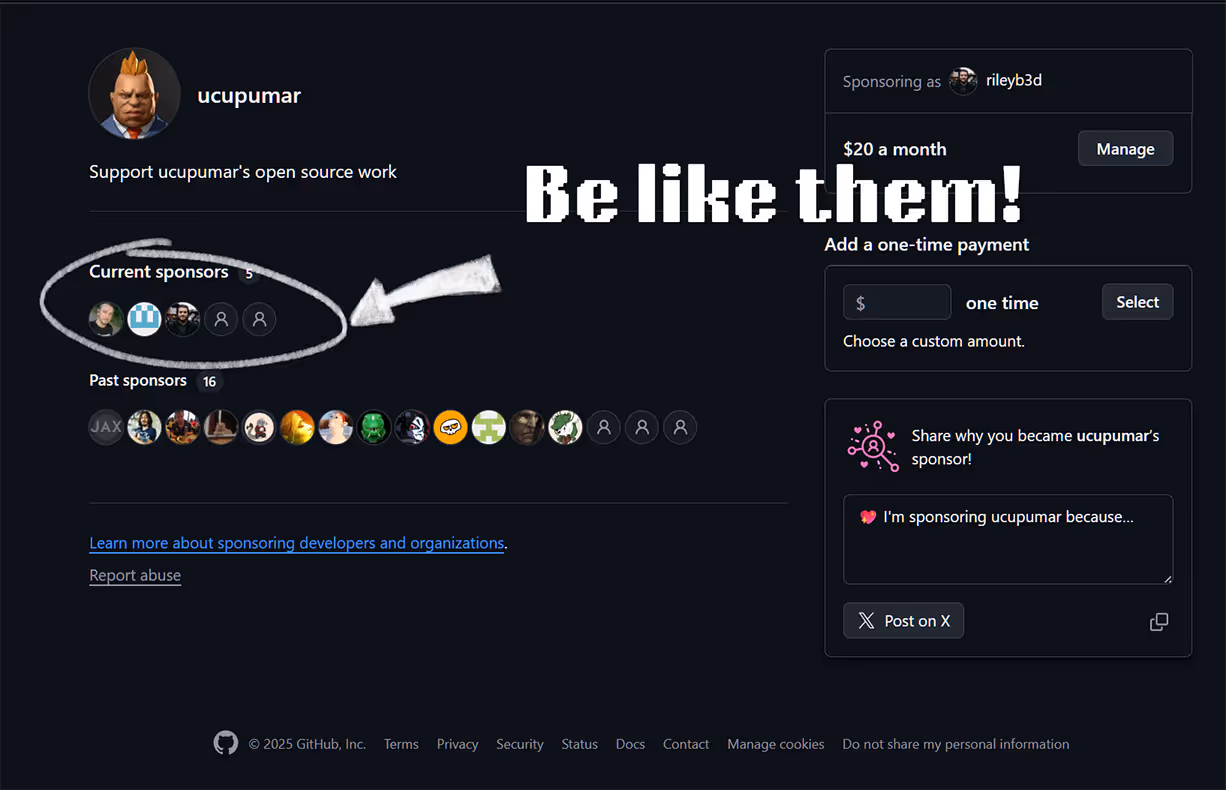 Go support ucupumar directly on GitHub by becoming a GitHub sponsor. Since my last post, he's gone from 3 to 5 supporters, but honestly he deserves a lot more, and this tool deserves to be backed by a community that uses it. Imagine if we 5x or 10x his support. That's what we could do if everyone reading this considered supporting.